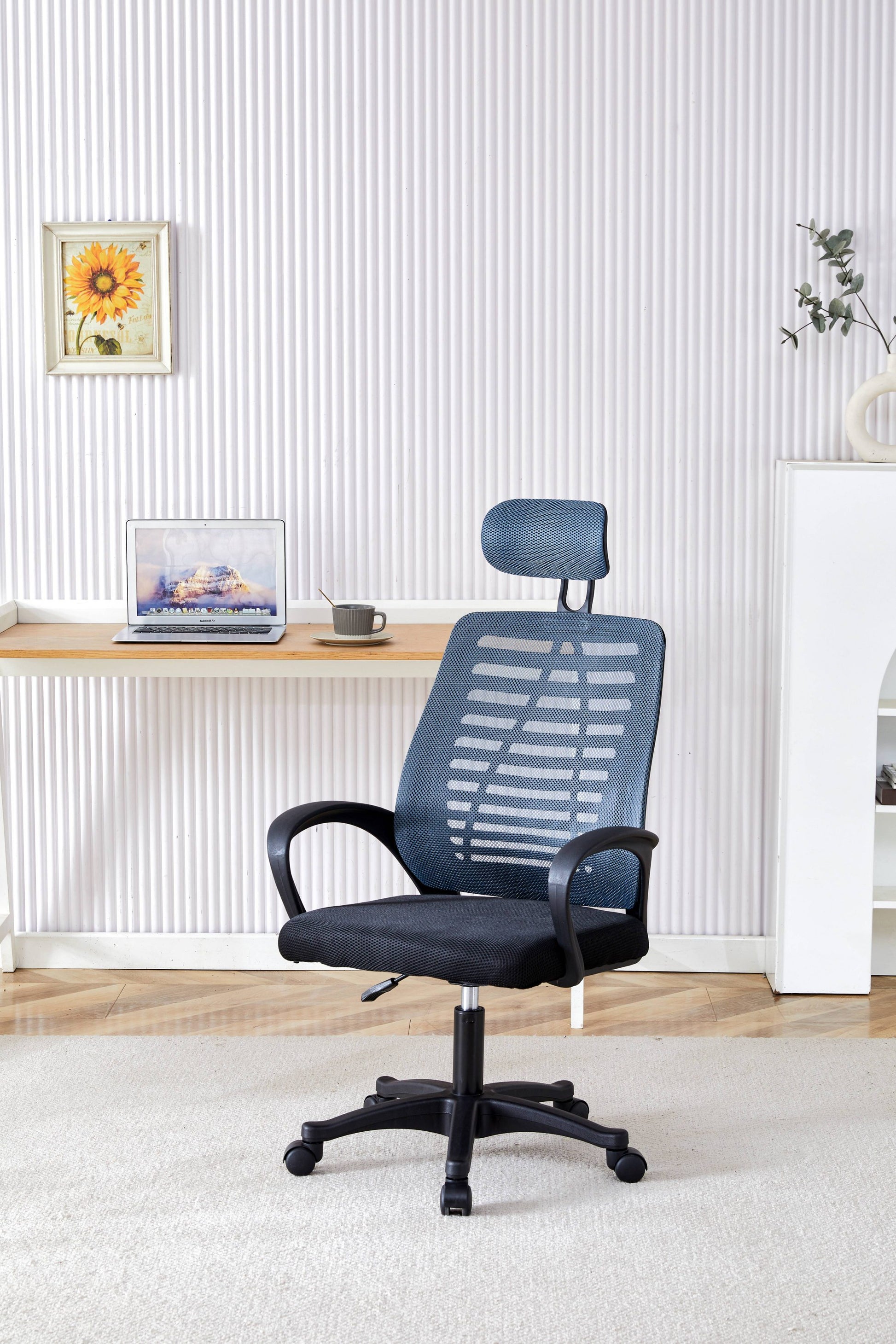 Summary Ergonomic Chair: Work in style with our ergonomic office chairs, designed to provide both a modern and comfortable seating option in your home office. Featuring a reclining tilt design and high-elastic foam cushioning, this computer desk chair offers generous support, alleviating fatigue during prolonged use. Mesh Fabric: Indulge in ultimate comfort with our ergonomic mesh back rest, offering unwavering back support during long sits. Crafted with a breathable mesh fabric and stylish striped design, our desk chairs enhance natural cooling, effortlessly allowing air, body heat, and moisture to pass through, ensuring a comfortable and refreshing working experience. Adjustable: Our office chairs for home feature integrated arm rests, an adjustable height with a 9cm range and chrome gas lift, adjustable headrest, and 360° swivel rotation, so you can personalise your work set up to suit your needs. Curved Back: Experience unwavering posture relief and essential lumbar support with the curved back and butterfly tilt on our office desk chair, designed to contour to your body and provide optimal support to your lumbar area. Specifications: These heavy duty office chairs include a detailed assembly manual and all parts included, for an effortless set up. Dimensions: 58cm(W), 65cm(D), 114-123cm(H), Maximum Load: (135kg). This black chair is the perfect addition to your home office furniture, but can also be used as a: Gaming chair, PC chair, executive office chair, study chair & for professional meeting room chairs.